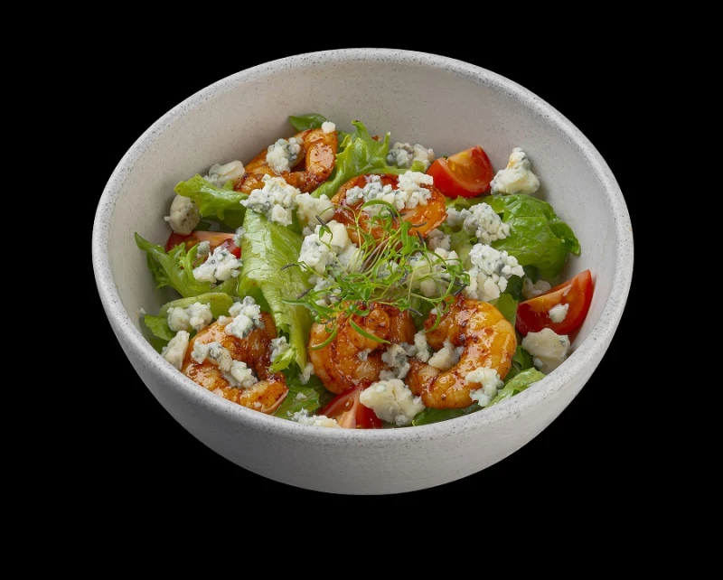 Креветка, салат, черри, сыр с плесенью, специи, соус сладкий чили