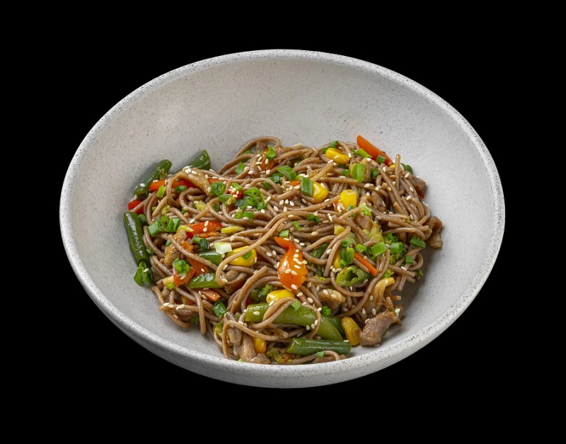 Свинина, лапша гречневая, овощи, грибы, специи, соус перечный