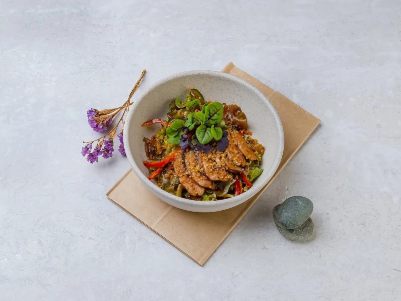 Острый салат из свежей зелени с нежной утиной грудкой и пряной заправкой
