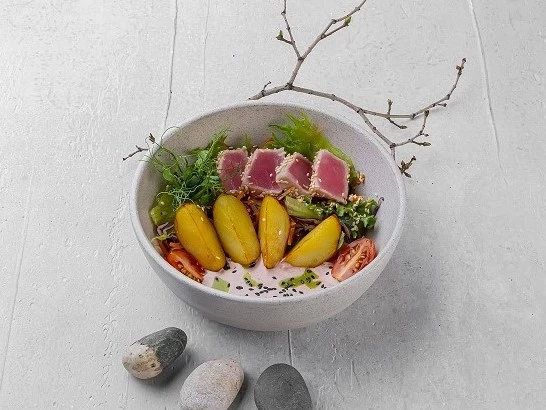 Салат из свежих овощей и зелени с жареным тунцом и молодым картофелем "бэйби" в соусе "айоли"