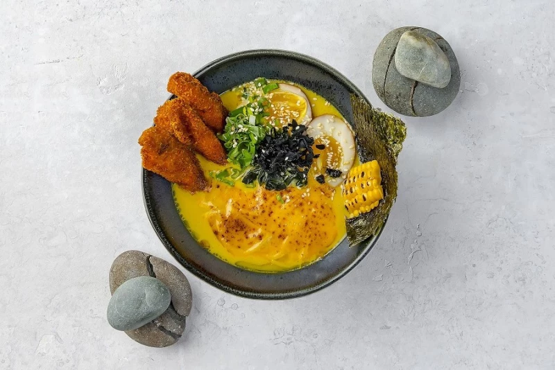 Наваристый, сытный, сырный рамен, приготовленный по оригинальному рецепту с жареной курицей "кацу", яичной лапшой, трюфельным маслом, а также маринованным куриным яйцом